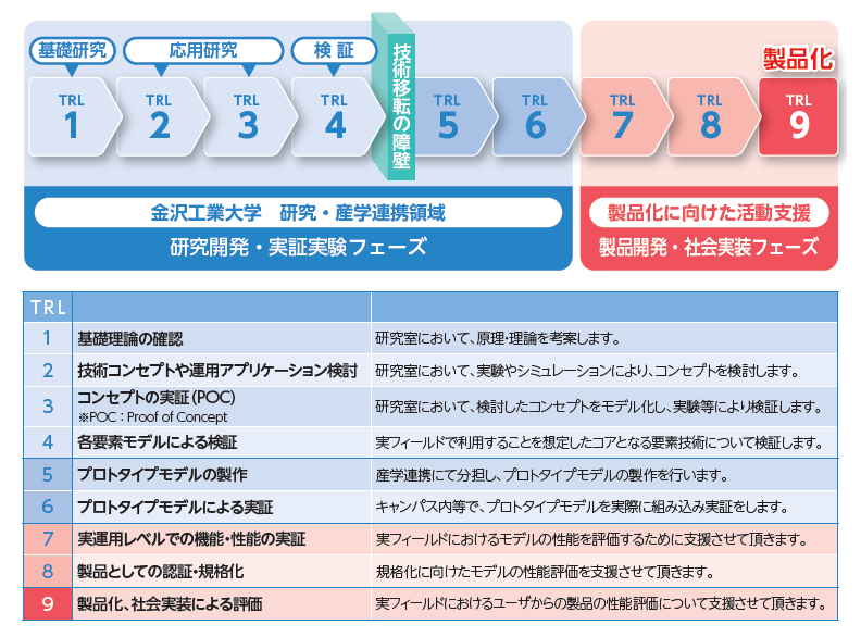 キーワードは「一気通貫・伴走支援」です。TRL(技術成熟度)の1〜6まで、基礎研究からプロトタイプ開発までを大学の役割と定義しています。多くの大学ではTRL3〜4で企業や外部機関にバトンを渡しますが、金沢工業大学は意図的に“プロトタイプまで大学でやる”体制を整えています。