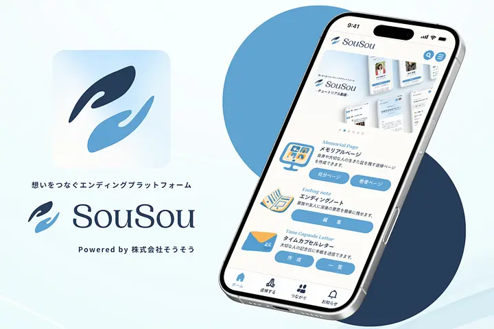 株式会社そうそう(SouSou)は、「縁起(つながり)」にフォーカスを当て、亡くなった後も残される人たちの想いや記憶をデジタルで“かたち”にするライフエンディングプラットフォームを開発・運営する企業です。