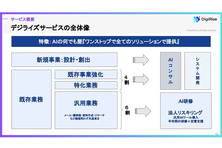 AI導入における「リテラシー不足」や「業務の属人化」という課題に対し、独自のAI研修プログラムや海外AI企業の日本展開支援、AIシステム開発を通じて解決を図ります。AIの利便性と感動を全業界へ普及させ、日本経済を次のステージへ引き上げるための革新的なソリューションを提供しています。
