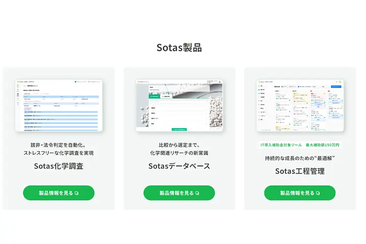 化学素材や企業情報を検索・比較できる「Sotasデータベース」、複雑な化学物質調査やSDS管理を自動化・一元管理する「Sotas化学調査」、さらに生産・在庫・受発注を統合管理する「Sotas工程管理」など、化学業界の実務に特化したサービスを展開しています。