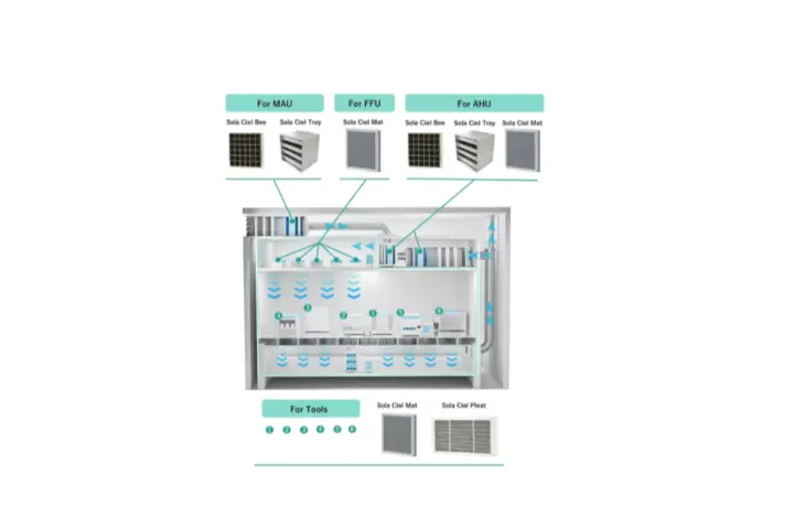 現在の中核事業は、半導体製造プロセスにおける空気環境管理を支えるケミカルフィルター「SolaCiel™」の開発・販売です。クリーンルーム内に存在する分子状汚染物質(AMC)を選択的に除去するこのフィルターは、有機ガス・酸性ガス・アルカリ性ガスなど多種多様な汚染物質に対応し、製造歩留まりの向上や労働環境の改善に直接貢献します。製品ラインアップはBee(ハニカム構造)、Tray(粒状活性炭)、Pleat(プリーツ状)、Mat(連続貫通孔)の4種で、外調機からファンフィルタユニットまで幅広い設備に対応可能です。